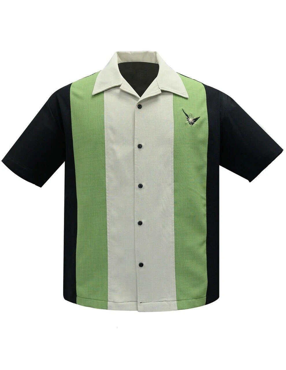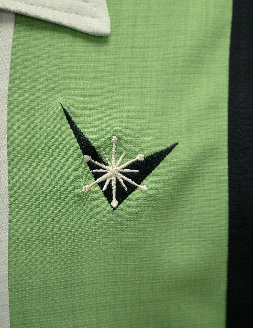 This multi-panel shirt features vintage colors and a classic midcentury boomerang and burst embroidery.