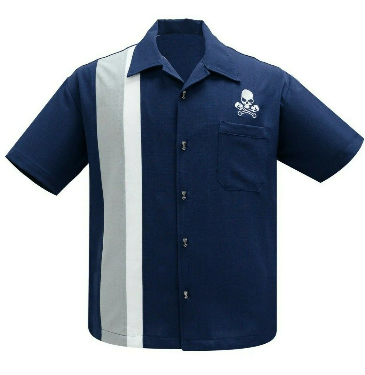 The classic Steady Hot Rod shirt gets a little edgy with dual contrasting panels, a bold red skull & pistons embroidery, and our custom dye-cut metal piston buttons.