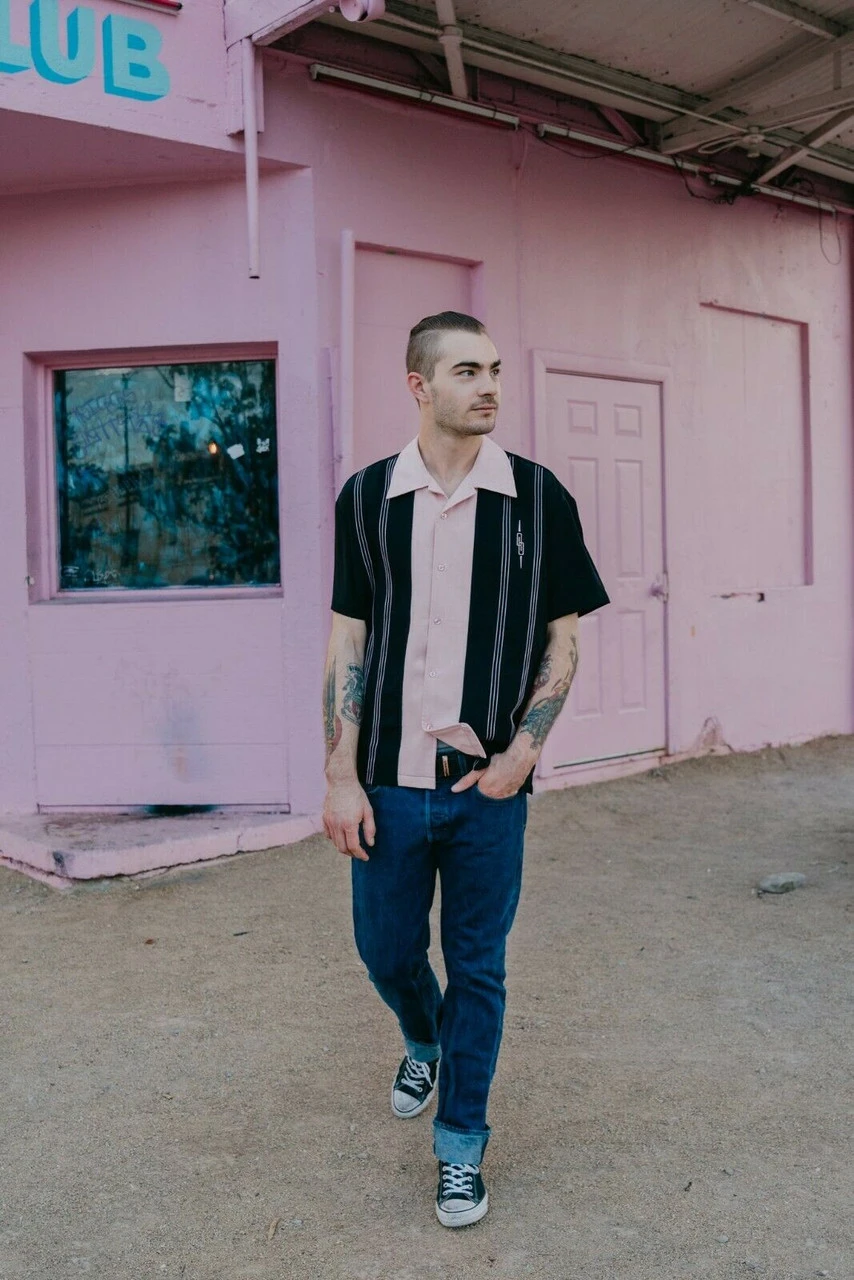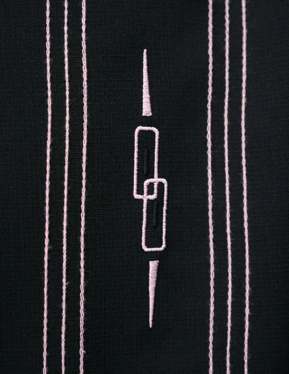 This retro-inspired shirt is casual, but classy, featuring a contrast center and running stitches on both sides. The mid-century embroidery of overlapped rectangles and points adds a touch of flair.