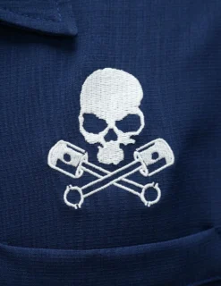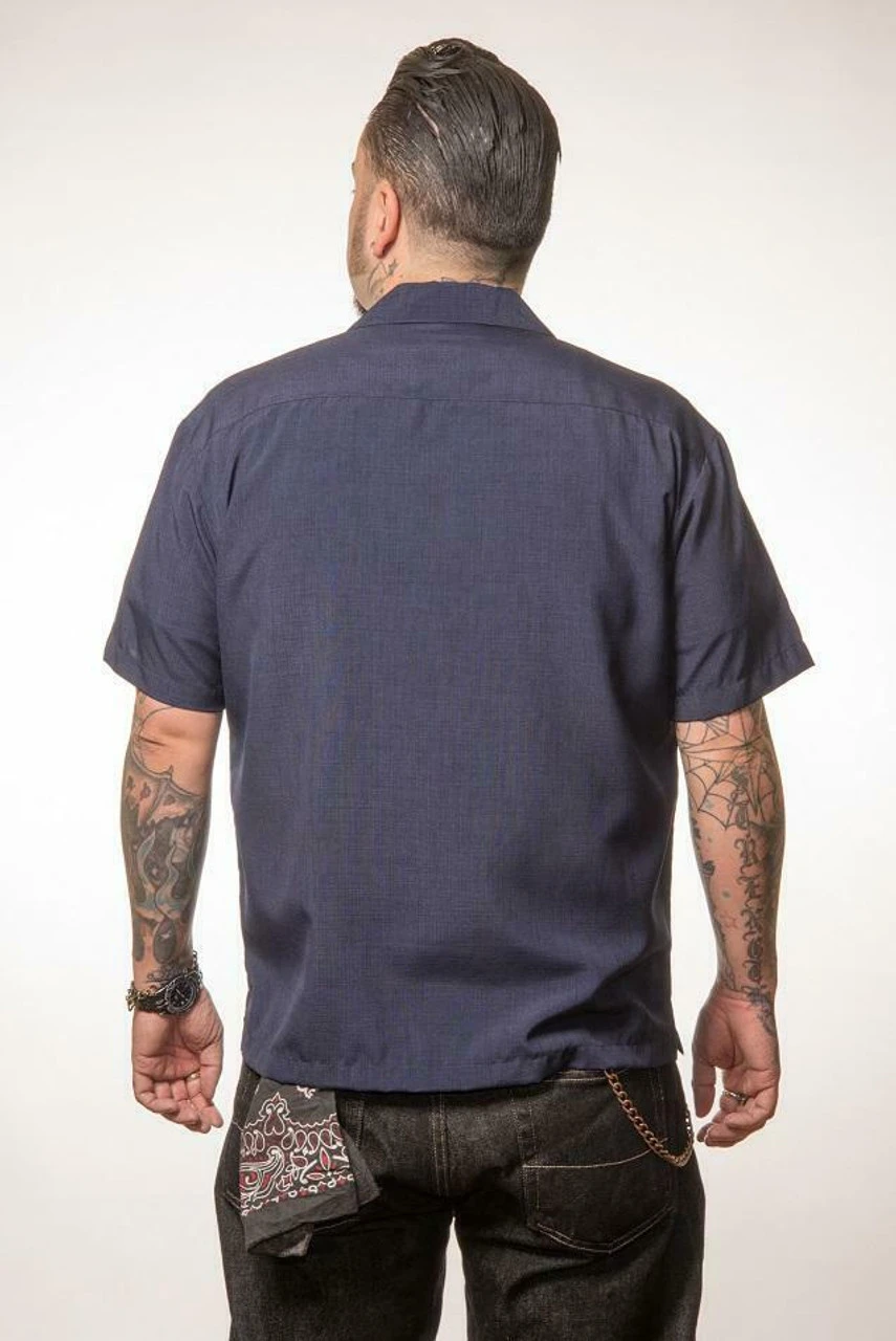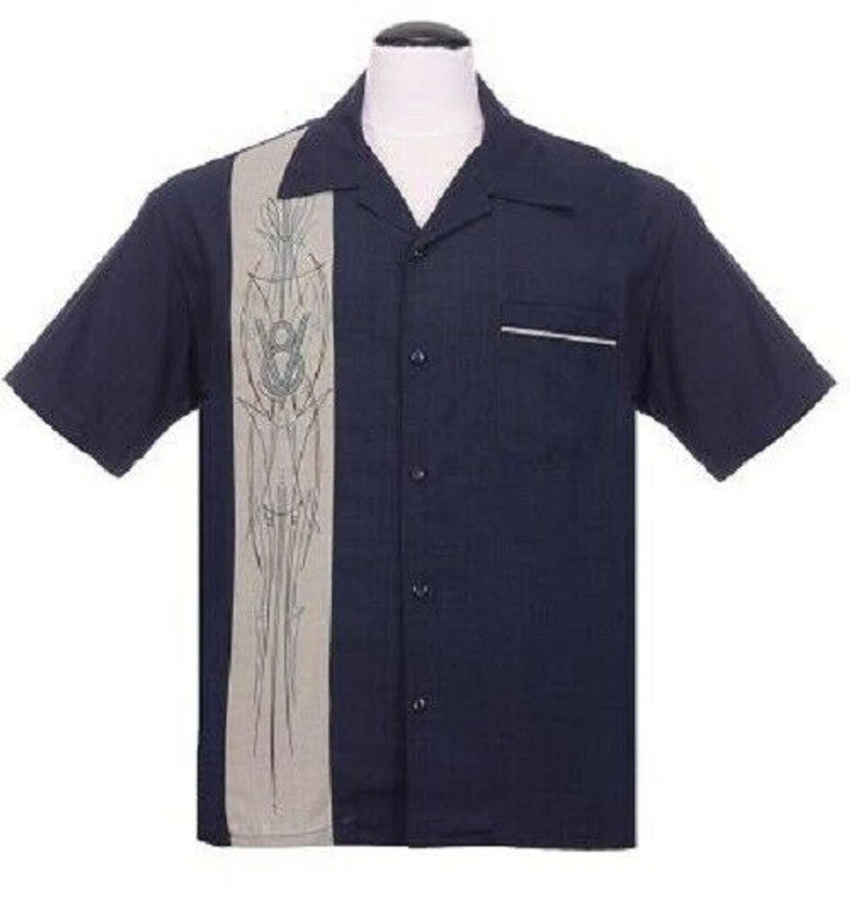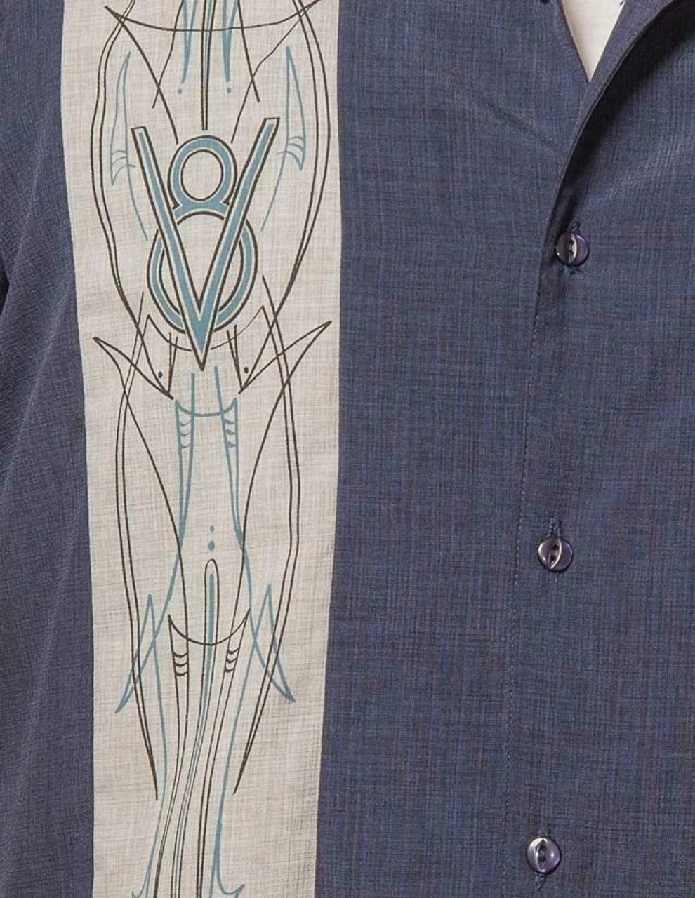 This single panel button up features V8 designed pin striping and a contrasting breast pocket. Inspired by hot rods, rock this shirt while out for a ride in your lead sled or to your local car show.