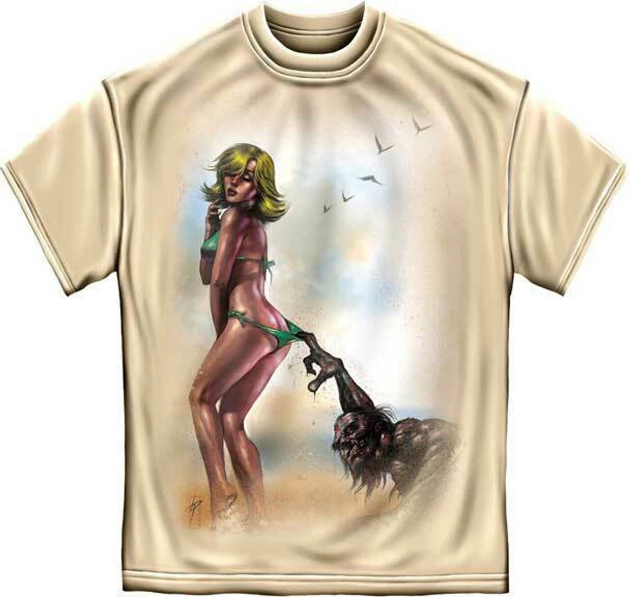 T-Shirt graphics depict a parody of the sunblock advertisement. Girl on the beach being attacked by a zombie.